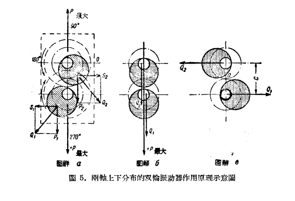 雙輪振動器也可以根據另一種作用原理(圖5)制造。此種振動器工作時在桿上產生兩種振動: (1)由旋轉著的不平衡體的離心力的垂直分力所產生的安排好規律變化的上下振動; (2)由水平分力的力偶矩所產生的橫向振動。 按此種作用原理制造的振動器和前者一樣,也有兩個安在垂直平面上的偏心輪。因為偏心輪的軸上安有有兩個齒輪,所以偏心輪是朝著相反的方向旋轉。